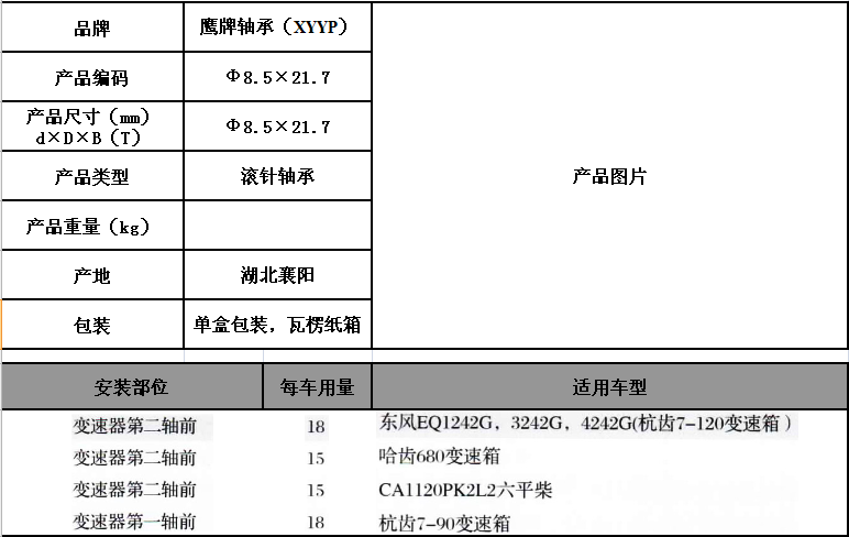 * 表(biao)示必(bi)填采(cai)購:滾(gun)針軸(zhou)承-Φ8.5×21.7-鷹(ying)牌軸(zhou)承